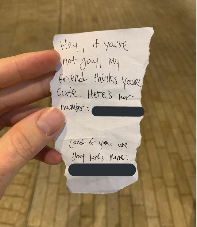 “I said, ‘ Sure. But why do you want to get together with me? I thought you were gay,’ and I pointed at the bottom part of the note that was still in his hand.”